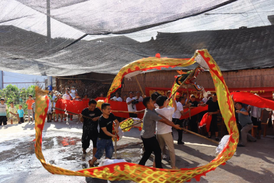 在当地村民的盛情邀请下,团队成员观看了一场盛大的舞龙表演,同时也将这场表演以直播的形式让更多人“置身现场”。一条巨龙在十几位舞龙人的控制下随着音乐声和锣鼓节奏上下翻飞,游走在几米高的空中。乐声时而急促,时而缓慢,巨龙的姿态也随之呈现出不同变化。在舞龙过程中,村民们还会向龙身洒水,目的是去火降灾,祈祷来年风调雨顺、国泰民安。