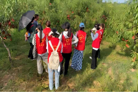 直播期间,团队成员在桃园负责人石海胜的指导下完成了部分桃树的“套袋”。“在操作之前我们还需要修剪,同时还要时刻注意每个桃子之间的距离,这样才能保证每个桃子的营养跟得上,修剪完之后才能‘套袋’。这个袋子一定要扎严实,它是防水的,那些‘套袋’之后的桃子汁水才能更足,也更不怕下雨或者暴晒。”为了保证桃子的卖相,石海胜一直在和每一位成员叮嘱有关“套袋”的注意事项。