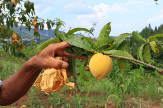 团队成员跟随周水儿走进黄桃林,一棵棵果树挂满了已经套好袋的黄桃,沉甸甸的果实压弯了枝头。桃树枝条肆意向四周生长,看似没有规律,实际却是有意为之。“这样能够方便黄桃采摘。”周水儿拆开袋子,给团队成员摘下了新鲜的黄桃。套袋的黄桃没有受到鸟儿的啄食,色泽金黄,个头饱满,令人垂涎。