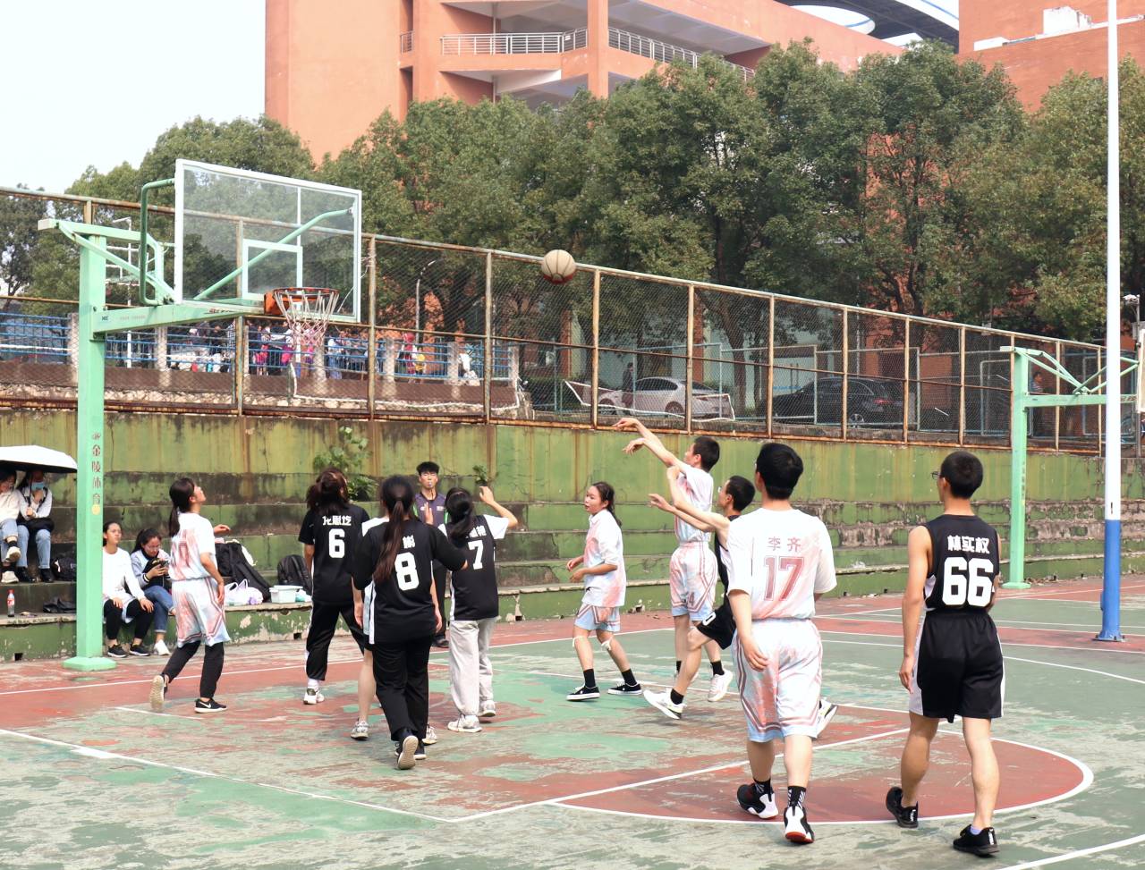比赛进入最后一场,场上氛围愈发紧张,场外的喝彩声也一浪高过一浪。中文二班6号龙思圪体力不减,反而越发迅猛,突破层层防线,凭借惊人爆发力六次进球。中文二班的球员们默契配合,传球给8号龚彬,篮球在空中划出一道道完美的弧线,实现四连进。新闻二班的球员们积极防守,展现出赛场上迎难而上的奋斗精神。