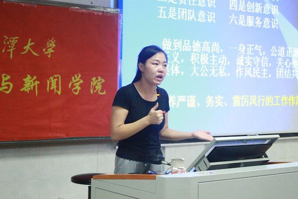 院党委副书记周鹏飞老师作开场致辞。他向学生会新增力量表示欢迎,并对学生会干部提出四点要求:一是秉承“千行百业,以德为先”的理念,明大德、养公德、严私德,做有德之人,行有德之事。二是坚持“大浪淘沙,以能为上”的思路,鼓励同学们在学生会这个大熔炉里久炼成金,不断提升管理能力、写作能力、沟通能力、演讲能力和组织协调能力。三是弘扬“飞扬梦想,以思为翼”的精神,希望学生干部不做简单的“传声筒”,要学会积极思考,敢于质疑,创造特色,做到人无我有、人有我优。四是倡导“创业艰难,以勤为径”的态度,周老师以勤奋作结,勉励新晋学生干部充分利用时间,兼顾学业与工作,从而拥有一段充实的大学生活。