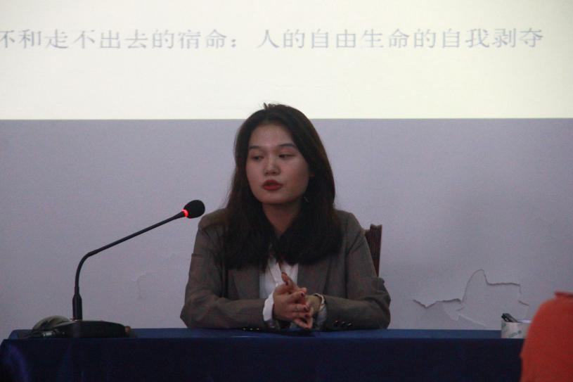 第一位主讲人付怡冰同学探讨的主题是:曹禺戏剧生命的创造和中国话剧的成熟。她指出曹禺的主体创作与社会批评之间一直存在差异、矛盾和不谐,她将从话剧入手,分析创作主体的情感世界、主体创造意图在戏剧作品中的体现,解释曹禺前期创作、转型后创作以及对曹禺的接受史,其对曹禺及作品的深入讲解,让同学们为之叹服,掌声雷动。在提问环节中,对如何找到自己的研究方向这一问题时,付怡冰同学认为,研究方向不用刻意去找,一些无功利的出发点,往往会有意想不到的收获。
