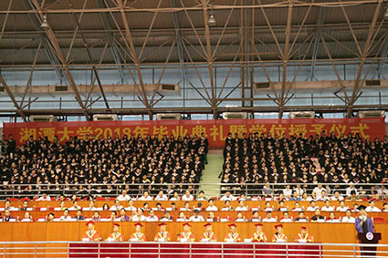 首先是由湘大艺术团的同学带来的开场表演,随着悠扬婉转的古筝演奏,全场安静下来;学生时代转眼已过,有关青春的记忆却能永远留在校园,一首活力四射的《青春快乐》让现场氛围格外热烈。诗朗诵《湘大之恋》和歌曲《老师》、《你曾是少年》更引得很多在场学生眼泛泪光,最后毕业纪念视频与校友祝福视频更展现了湘大情怀,为毕业生送去了满满的祝福。伴随着热烈的气氛,校党委书记黄云清宣布毕业典礼正式开始。