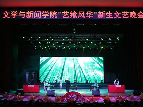 本场晚会以“艺飨风华”为主题。舞台整体布置精致巧妙,富有文艺气息。舞台以红纱为前缀,饰以黄色气球。精美巧致的朱红纸扇置于红纱中央,扇上灼灼桃花,古韵十足。本场晚会共有14个节目,包括了歌舞、朗诵、情景剧等异彩纷呈的内容,为现场观众打造了一场美妙的盛宴。伴随着音乐的律动,观众们秩序井然地进入会场,舞台两侧的微信墙上观众也开始纷纷“打call”。之后,在主持人与现场观众的共同倒计时下,晚会正式开始。