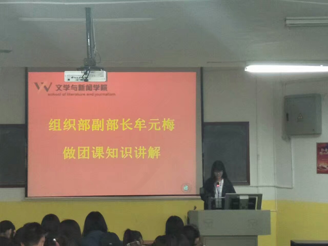 第一部分,由组织部副部长牟元梅为大家进行团的基本知识讲解。团的知识讲解分为四个部分,分别是团的历史沿革、组织原则和基本任务、入团条件和组织特征。