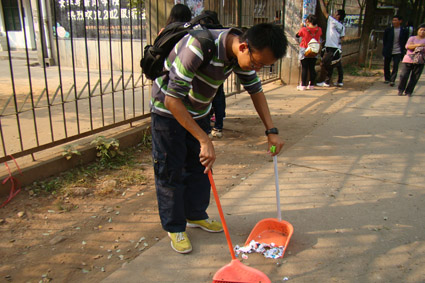 学员们分为两个小组,一组负责清理栅栏和墙壁上的小广告,另一组负责打扫北苑主干道。工作分配完毕之后,学员们拿起工具,迅速投入到劳动中。负责清理小广告的学员们拿着们水桶、抹布、刷子等工具,秉着“不放过任何一个角落”的精神,将北苑两侧的“牛皮癣”清除得一干二净。负责打扫干道的学员们带着扫把、簸箕、编织袋等工具,把枯叶、烟蒂、瓜果皮等垃圾集中运送到垃圾站进行处理。