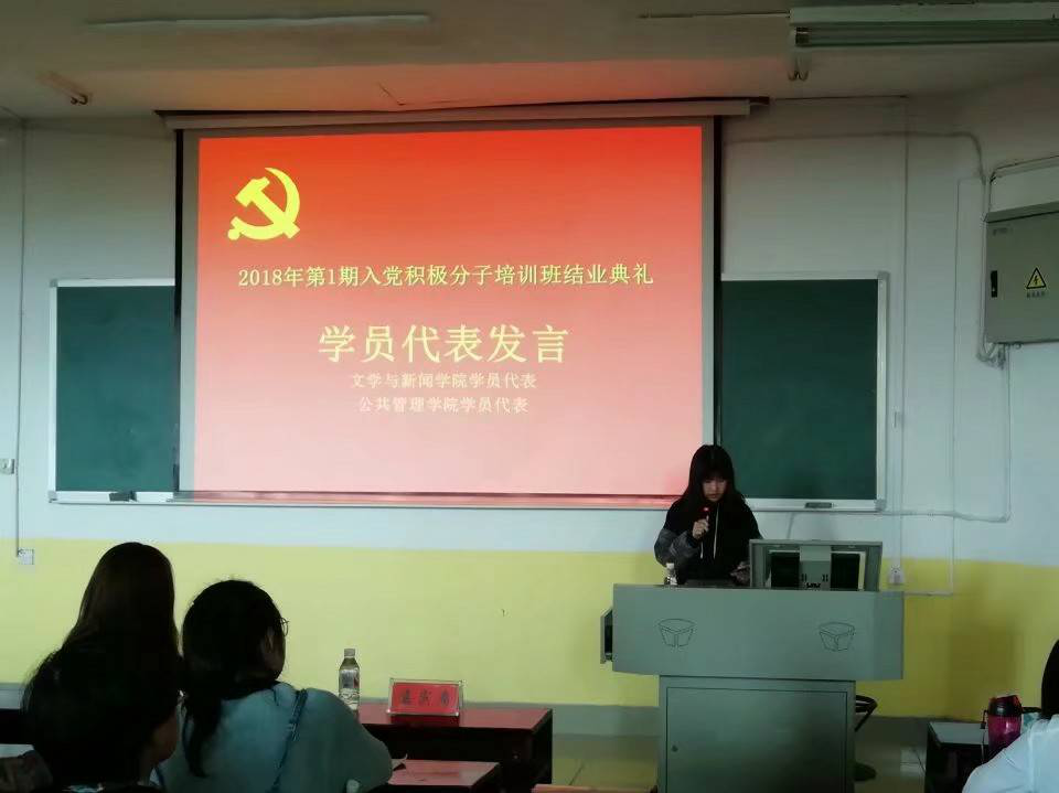 在专题讲座结束后,2018年第一期入党积极分子培训班结业典礼开始。大会第一项,学员代表发言,分别由Betvictor中文版学员代表谢一迪和公共管理学院学员代表黄杰上台分享他们接受这次党课培训后的心得体会。大会第二项,请班主任总结培训班学习情况,对此,班主任主要讲了两点:一是要主动学习,功夫在平时;二是要遵纪负责,为自己而活。
