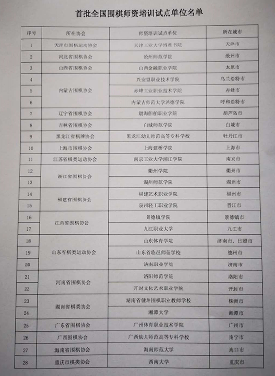 中国围棋协会是体育社会化、实体化改革之后,全面负责全国围棋事务的唯一领导机构,近期的工作重点就是全面推进全国围棋师资培训,此前已经发布《关于开展全国围棋师资培训工作的指导意见》《全国围棋师资行业标准及管理办法》和《全国围棋师资培训培养方案》等文件,此次培训试点单位的确立,是全国围棋师资培训走向具体实施阶段的开端。