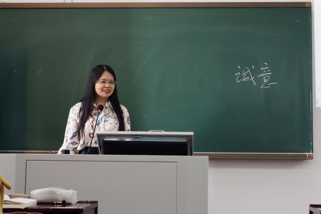 本次示范教学“思享会”的主题为“《古代汉语》文选研读”。唐智燕教授首先抛出“你爱钱财吗?你爱美色吗?”的现场调查,在轻松活跃的课堂氛围中肯定了人性对钱财和美色的普遍喜爱,并通过《大学·第七章》中的“所谓诚其意者,毋自欺也”引导同学们诚实地直面自己的内心想法,并思考和讨论“什么是真正的君子”这一问题,由此引出本次示范课教学的主要研读文本——《大学·第七章》节选。在接下来的文本研读中,唐智燕教授先后安排了三次文本的诵读,这三次诵读各有“深意”:第一次诵读在文本解读之前,同学们因不识字或不解义而吞读、误读的现象时有发生,自然也由此找出了文本研读的重点和难点字词;在唐智燕教授对文本中的两组同形词“好hǎo-好hào”和“恶wù-恶è”以及第一次诵读中同学们普遍出错的“谦”“臭”“参”等字读音一一加以讲解和辨正后,同学们对古今字、通假字、异体字三者差异的理解更加深刻,第二次诵读的发音也因此既准确又整齐;在疏通全文字词音、义的基础上,唐智燕教授又进一步对全文的思想内涵进行了深入的挖掘,结合现实阐释了“诚其意”“慎其独”对当今大学生塑造君子人格和品性的重要性,由于较为透彻地理解了文本的思想内涵,第三次的诵读很多同学已经可以脱稿将文本背诵出来。