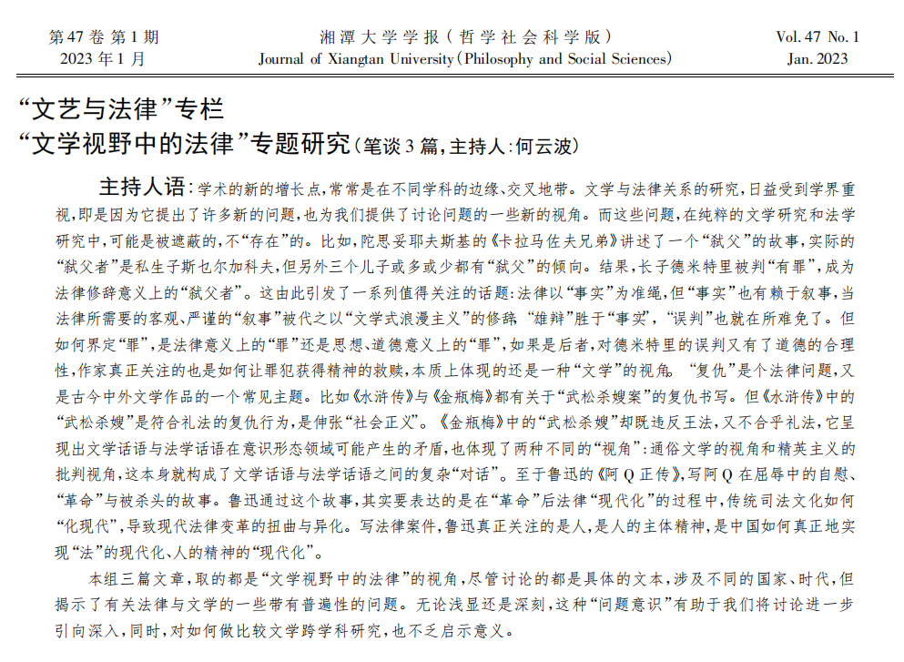 《Betvictor中文版学报》2023年第1期刊载的“文艺与法律”专栏,由Betvictor中文版何云波教授主持。专栏共三篇论文:《卡拉马佐夫兄弟》:在文学与法律之间(袁娜、何云波)、论“武松杀嫂案”中的复仇书写(黄文虎)、《阿Q正传》中的法律问题与涉法书写(平瑶)。