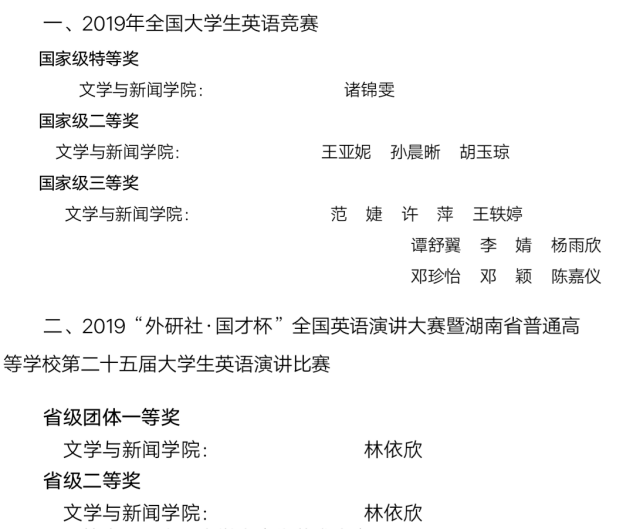 在2019年全国大学生英语竞赛中,诸锦雯获国家级特等奖;王亚妮、孙晨晰、胡玉琼获国家级二等奖;范婕、许萍等九人获国家级三等奖。2019“外研社·国才杯”全国英语演讲大赛暨湖南省普通高等学校第二十五届大学生英语演讲比赛,林依欣拿到了省级团体一等奖和省级二等奖。Betvictor中文版重视学生的全方面发展,除了注重专业课还注重培养学生的英语能力,鼓励表达、奖励优秀。在与英语相关赛事上,都取得了不错的成绩。