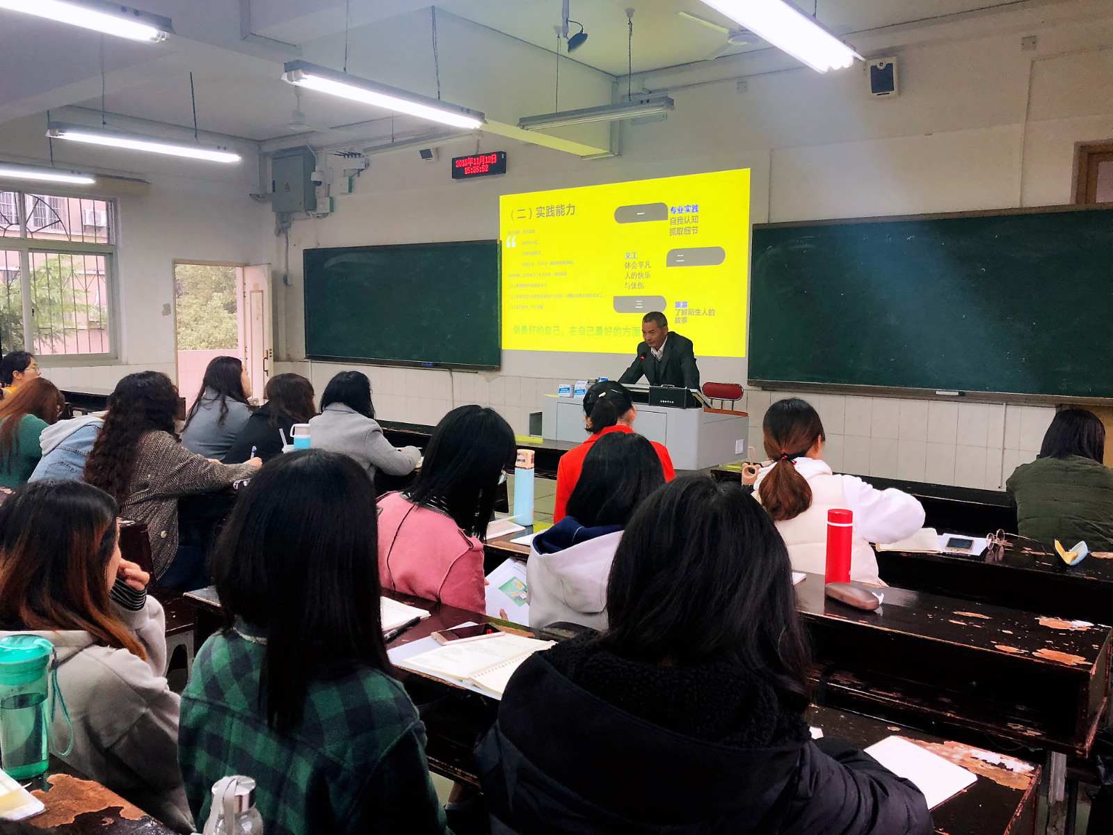 选位部分,肖老师结合自己的实践经历,向大家介绍湘潭日报社新媒体中心的运作方式。也给同学们以后的学习和实践提出建议:年轻人既要提升自己的专业理论素养——上好每一堂课、积极关注国家大事、多阅读经典,形成新闻人该有的时代担当,不做“吃瓜群众”和冷漠的看客;也要提升自己的实践能力——参加专业实践、周末担任义工、寒暑假旅游。他强调,新闻工作是理论性很强的业务工作,又是业务性很强的理论工作。