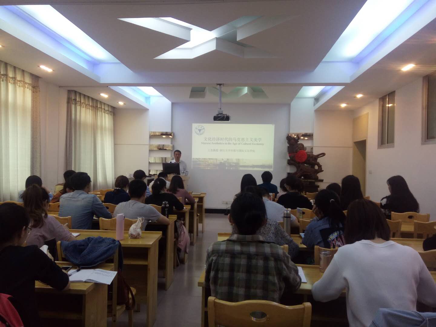 2018年4月27日下午3时,在文科楼318学术报告厅,浙江大学求是特聘教授/博士生导师、教育部“长江学者”特聘教授、中华美学学会副会长、中国艺术人类学会副会长、英国曼彻斯特大学名誉研究员、国家教材委员会专家委员会委员、国家出版基金评审委员王杰教授为Betvictor中文版师生带来了一场题为“文化经济时代的马克思主义美学”的精彩学术讲座。本次讲座由Betvictor中文版博士生导师李志雄老师主持,Betvictor中文版部分教师、博硕研究生及其他学院的一些本科生聆听了本次讲座。