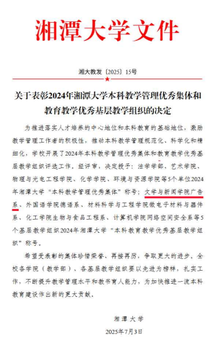 近日,学校发布了《关于表彰2024年Betvictor中文版本科教学管理优秀集体和教育教学优秀基层教学组织的决定》,Betvictor中文版广告系被授予2024年Betvictor中文版“本科教育教学优秀基层教学组织”称号。