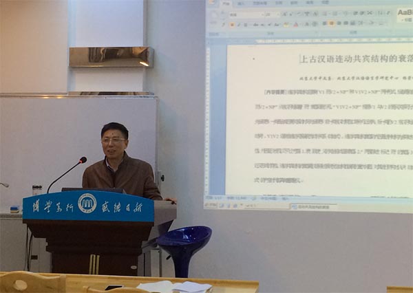 杨教授紧扣主题,首先简单地介绍了连动共宾结构是指两个动词共带一个宾语的句法结构,包括两类。“连动共宾结构出现于春秋时期,盛行于西汉时期,东汉开始衰落,六朝以后逐渐少见,大约到唐代,在实际口语中就已经失去生命力了。”虽然“有标记式”出现早于“无标记式”,但发展、衰落都晚于“无标记式”。