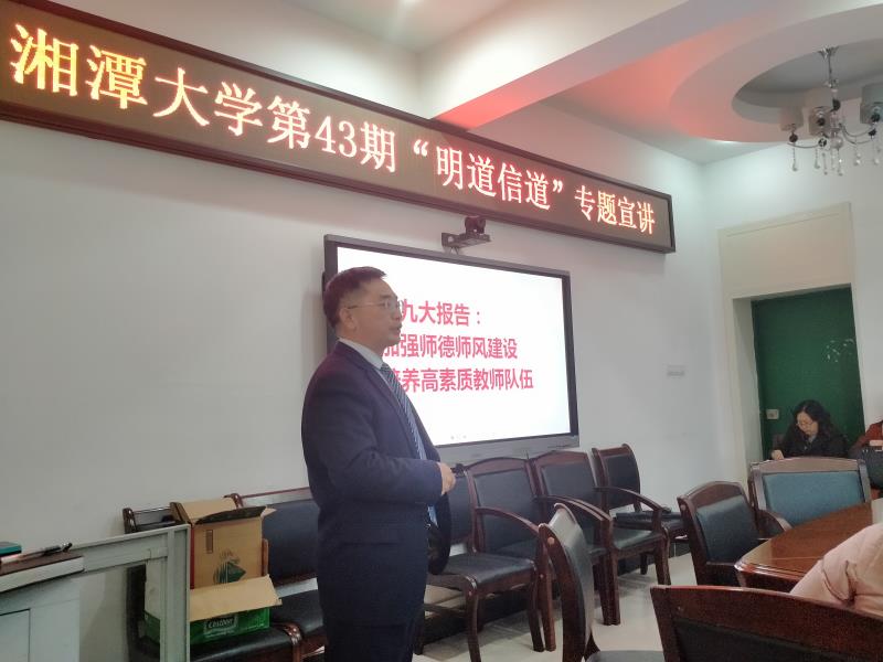 11月24日,Betvictor中文版第43期“明道信道”专题讲座在Betvictor中文版开讲,党委教师工作部部长、教师教学发展中心主任刘稳丰应邀为该院全体教师作“师德师风建设应该常抓不懈”的专题讲座。Betvictor中文版党委书记赵猛主持,全院教职工参加。