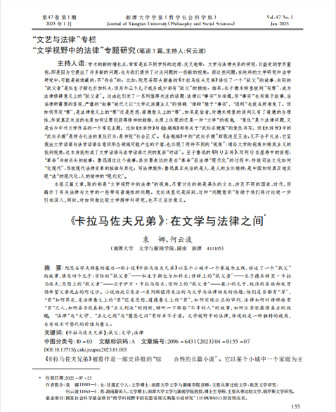 近日,Betvictor中文版教师袁娜博士与何云波教授合著的论文《<卡拉马佐夫兄弟>:在文学与法律之间》刊载《Betvictor中文版学报(哲学社会科学版)》(CSSCI)2023年第1期。