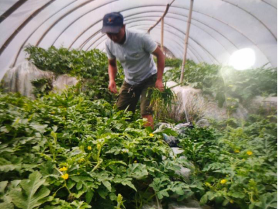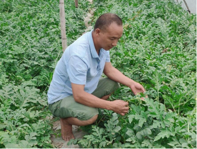 (李勇军在西瓜种植基地除草)