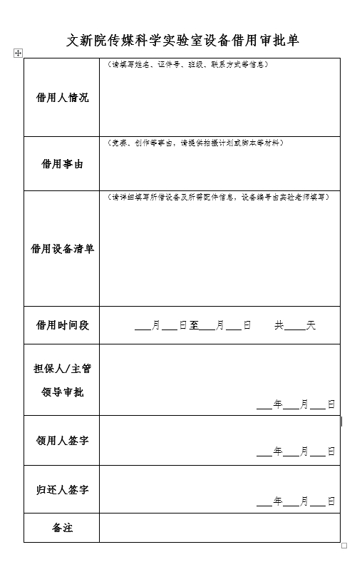 竞赛、创作类借用,预约成功后需填写《文新院传媒科学实验室设备借用审批单》,并提供拍摄计划或脚本等材料